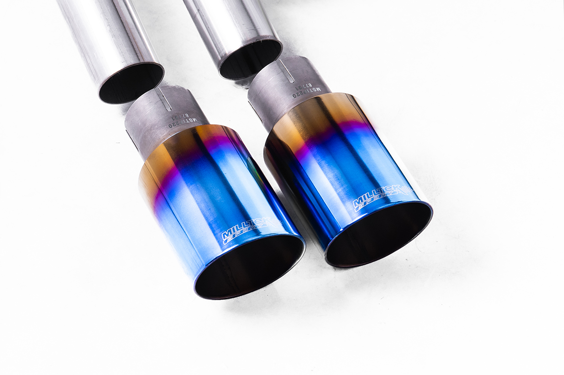 Auspuffanlage ab Katalysator Geeignet für: Volkswagen Golf (Mk7.5 1.5TSI Evo GT & R-Line (sowohl GPF/OPF- als auch Nicht-GPF/OPF-Modelle)) | Baujahr: 2017-2021 | Bemerkungen: GTD Twin Outlet Style ohne Resonanz (lauter) hinten ab Kat mit Burnt Titanium Endrohre – Erfordert Golf 7.5 GTD Heckschürze