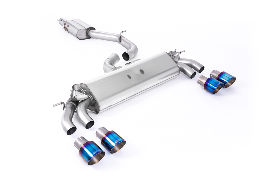 Système d'échappement après catalyseur Convient à: Audi S3 (2.0 TFSI quattro 3 portes 8V.2 (modèles équipés de GPF uniquement)) | Année de construction: 2019-2020 | Commentaires: Dos GPF résonné avec des embouts en titane brûlé quadruples ronds - Approuvé CE